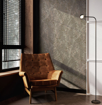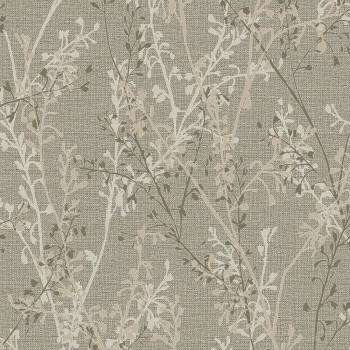 Vliestapete mit braun-beiger Stoffstruktur, geprägte Zweige in Grau, Beige und Gold-Beige.