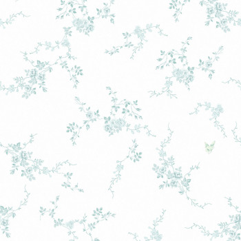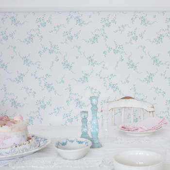 Vliestapete für die Wand, weißer Hintergrund, Blumenmuster in blau-grünen / Duck Egg Tönen.