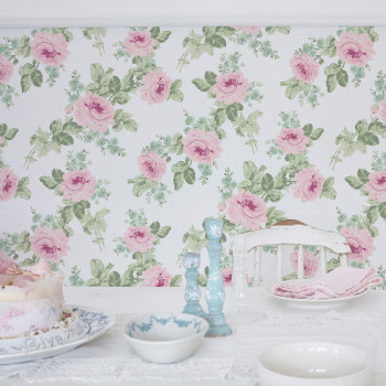 Vliestapete für die Wand, weißer Hintergrund, romantisches Blumenmuster in Rosa- und Grüntönen.