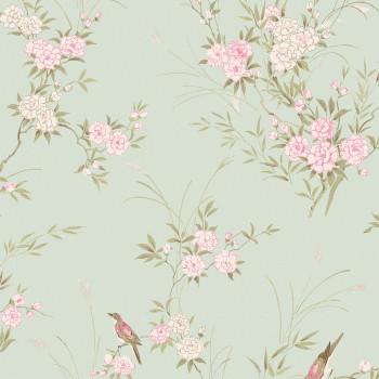 Vliestapete für die Wand, inspiriert von Chinoiserie, pastellgrüner Hintergrund, Zweige und Vögel in Rosa-, Braun- und Grüntönen.