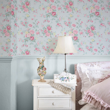 Vliestapete für die Wand, pastellblauer Hintergrund, Blumenmuster in Rosa-, Grün- und Gelbtönen.