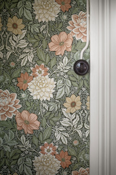 Vliestapete mit üppigem Blumenmuster in Grün-, Beige- und Rosatönen.