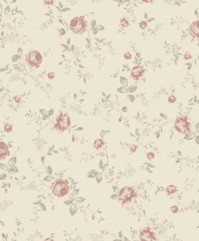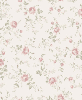 Wandtapete mit einem Off-White Hintergrund und Rosenmotiven in den Farben Grün und Rosa.
