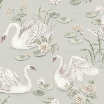 Wandtapete mit einem cremefarbenen Hintergrund und Schwänen auf einem See in den Farben Braun, Beige, Grau und Hellocker.