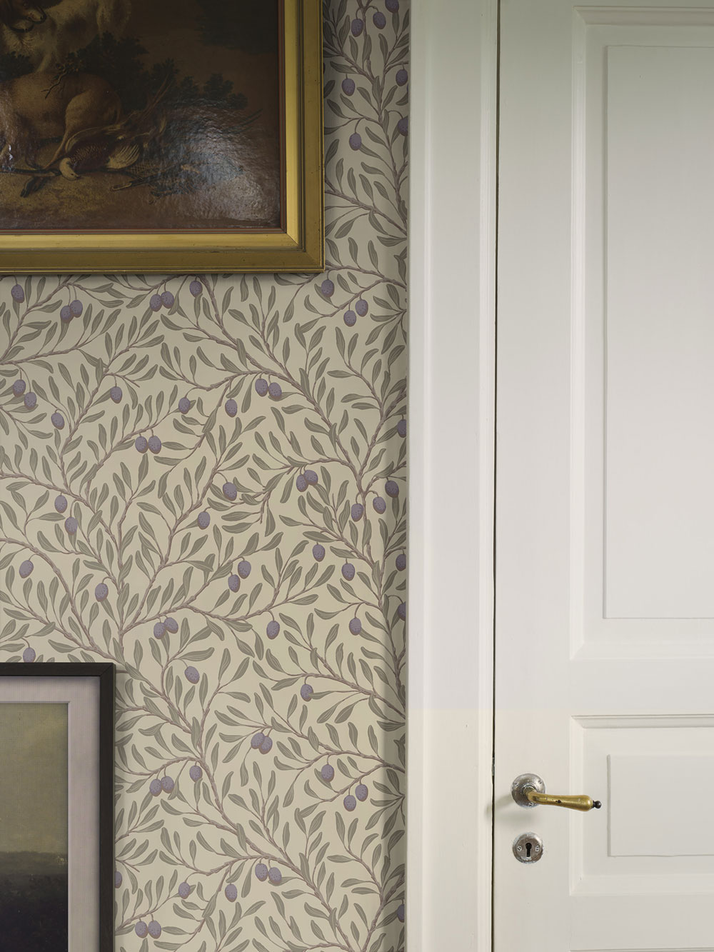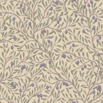 Tapete mit gelbgrünem Hintergrund, Olivenbaum-Motiv mit reifen Früchten.