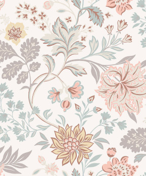 Vliestapete mit üppigem Blumenmuster in pastelligen Grün-, Gelb- und Rosatönen auf cremefarbenem Hintergrund.