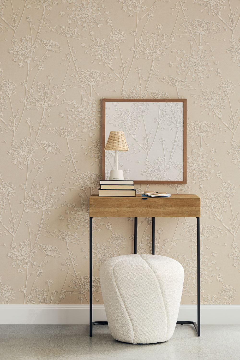 Tapete mit Muster aus blühenden Wiesengräsern in Beige- und Weißtönen – plastische Textur.