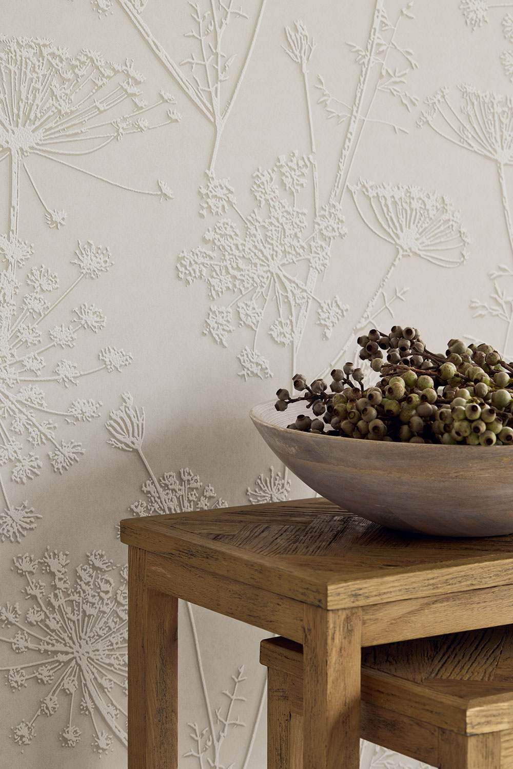 Tapete mit Muster aus blühenden Wiesengräsern in Hellgrau- und Weißtönen – plastische Textur.