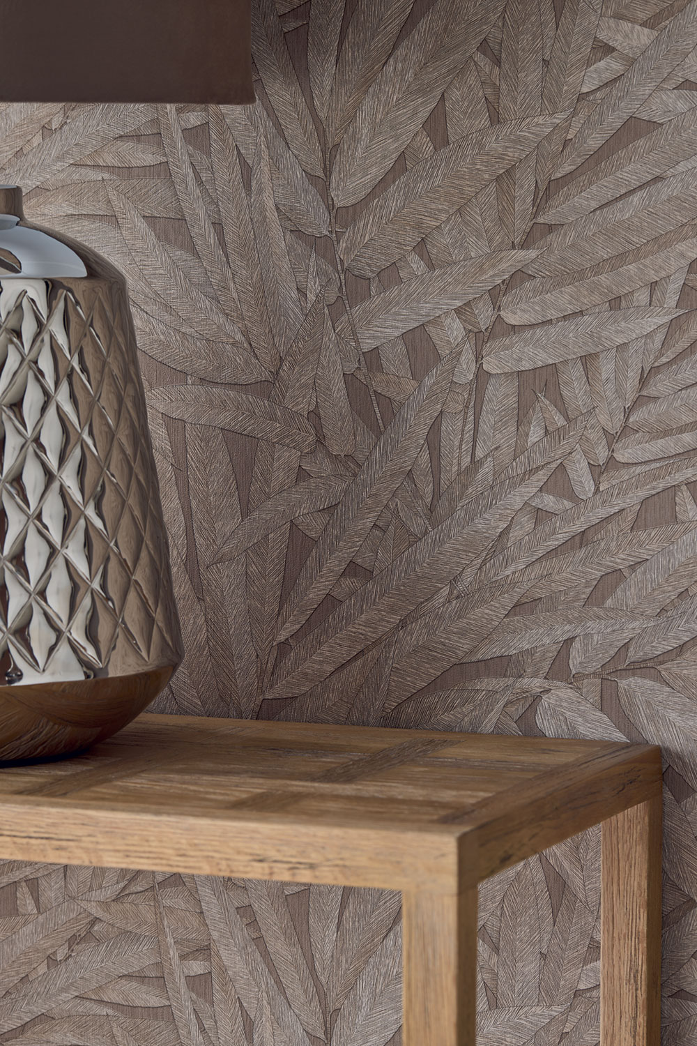 Tapete mit Blättermuster in Brauntönen, leicht plastischer Hintergrund.
