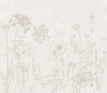 Fototapete mit Motiv aus blühenden Blumen und Wiesengräsern in Creme- und Weißtönen.