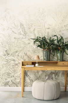 Fototapete mit Blattmotiv in Grau-Grün-Tönen.