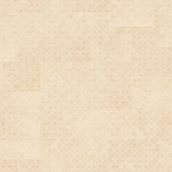 Luxus-Tapete mit Vinyloberfläche, halbglänzender Hintergrund in Beigetönen, feines plastisches gold-beiges Karomuster, Farbtöne bilden ein flächiges geometrisches Design.
