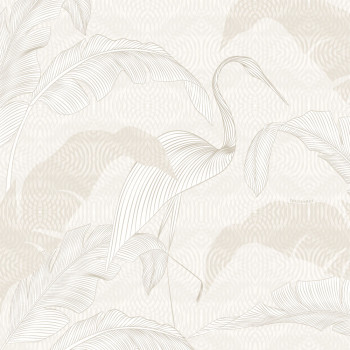 Luxus-Bildtapete mit Vinyloberfläche, Ibis zwischen Blättern, Weiß- und Grau-Beigetöne.