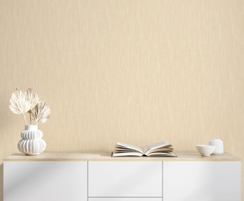 Vliestapete mit Vinyloberfläche, seidenglänzende Beigetöne mit goldenen Akzenten, Design erinnert an groben luxuriösen Stoff.
