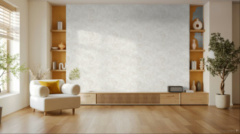 Vliestapete mit Vinyloberfläche, Weiß- und Cremetöne, perlmuttfarbene Glanzelemente, plastische stilisierte Blumen.