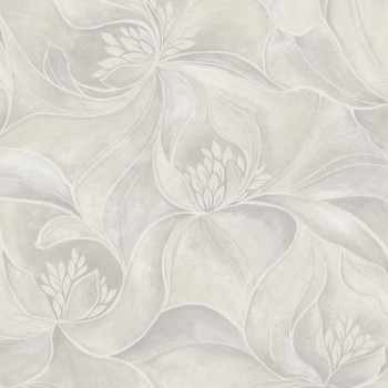 Vliestapete mit Vinyloberfläche, Grautöne, silberne Glanzelemente, plastische stilisierte Blumen.