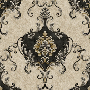 Vliestapete mit Vinyloberfläche, heller grau-beiger Hintergrund, schwarzes und braunes Muster mit feinem Glitzereffekt.