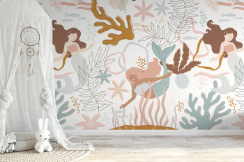 Vlies-Fototapete für Kinder mit Unterwassermotiv und Meerjungfrauen.