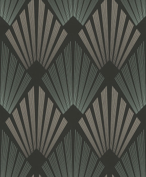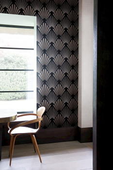 Vliestapete mit partiell plastischem Muster im Art-Déco-Stil, schwarze Töne mit grau-beigen Linien im Muster, matt und mit metallischem Glanz.