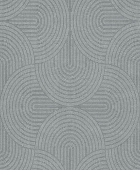 Vliestapete, grafisches Bogenmuster in graugrünen Tönen mit leichtem Glanz, textilähnliche Struktur.