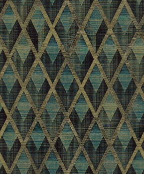 Vliestapete, geometrisches Muster in Grün- und glänzendem Goldton.