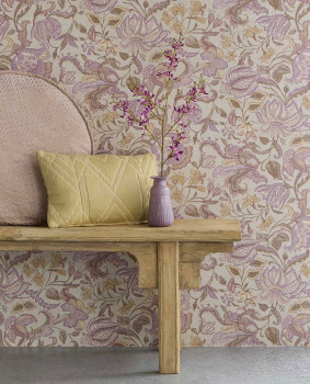 Luxuriöse Vinyltapete auf Vliesträger, beigefarbener Hintergrund mit textiler Struktur, ornamentales Blumenmuster in Braun-, Violett-, Altrosa- und Ockertönen.
