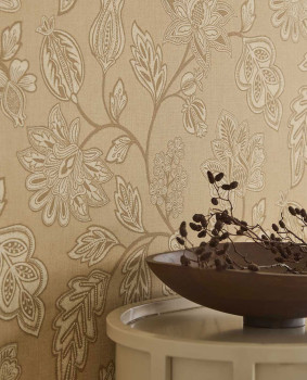 Vliestapete mit textiler Struktur, ornamentales Blumenmuster in Braun-, Beige-, Terrakotta- und Orangetönen.