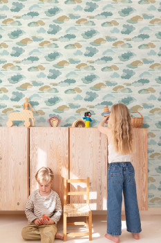 Vliestapete mit Vinyloberfläche, weißer Hintergrund, Wolkenmotiv in Grün-, Blau-, Türkis- und Ockertönen, Körnchentextur.