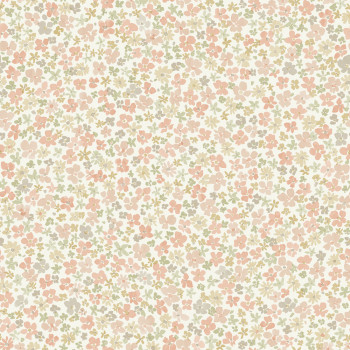 Vliestapete für die Wand, Blumenmuster in Rosa-, Grün- und Ockergelbtönen, weißer Hintergrund, Stoffoptik und -struktur.