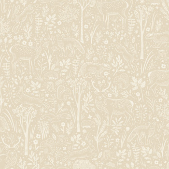 Vliestapete für die Wand, Muster Waldtiere, Bäume und Pflanzen, hellbeige Töne, Stoffoptik und -struktur.
