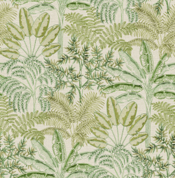 Vliestapete mit Vinyloberfläche, grobere cremefarbene Stoffstruktur, Pflanzen- und Blattmotive in Grüntönen.