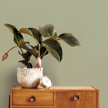 Vliestapete mit Vinyloberfläche, salbeigrün, grobe Stoffstruktur.