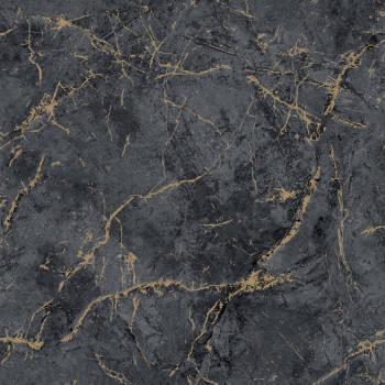Vliestapete mit Vinyloberfläche, Marmoroptik in Grau-Schwarz, halbglänzende goldene Marmorierung, feine Textur.