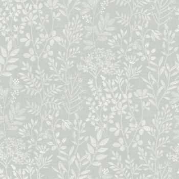Vliestapete mit Vinyloberfläche, grauer Hintergrund mit Stoffstruktur, Motive von Gräsern und Blättern.