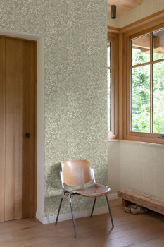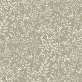 Vliestapete mit Vinyloberfläche, salbeigrüner Hintergrund mit Stoffstruktur, Motive von Gräsern und Blättern.