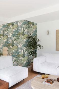 Vliestapete mit Vinyloberfläche, cremefarbener Hintergrund, Baum-Motive in Grün- und Brauntönen, feine Textur.