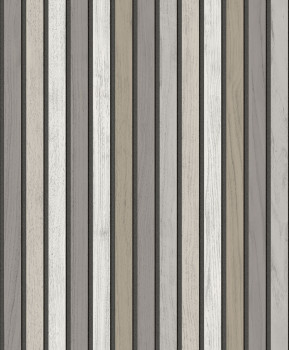 Vliestapete mit Vinyloberfläche, Holzimitat in Brett-, Verkleidungs- und Lamellenoptik, leicht plastische Textur, in Grau- und Braun-Grautönen.