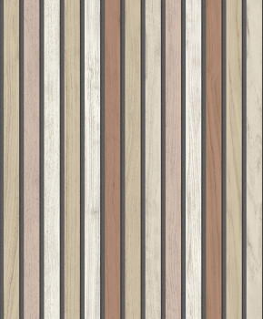 Vliestapete mit Vinyloberfläche, Holzimitat in Brett-, Verkleidungs- und Lamellenoptik, leicht plastische Textur, in Creme-, Beige-, Beige-Rosa- und Terrakottatönen.
