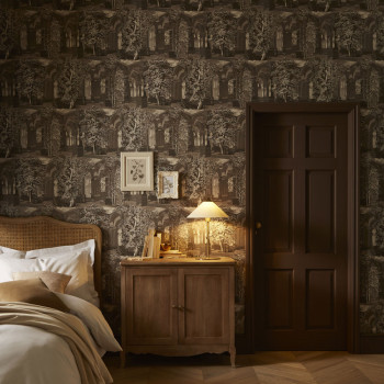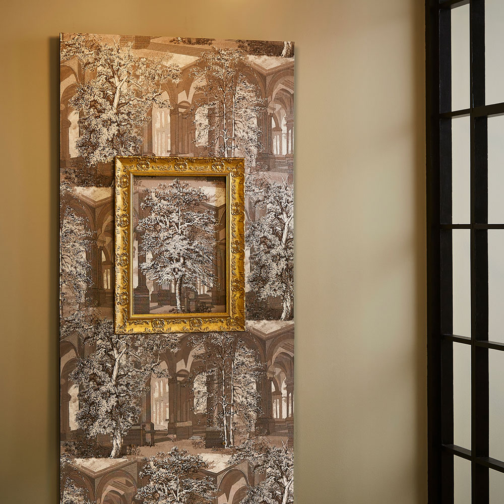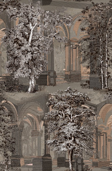 Vliestapete mit Motiv von historischen Arkaden und Bäumen in halbglänzenden Braun- und Graubraun-Tönen.