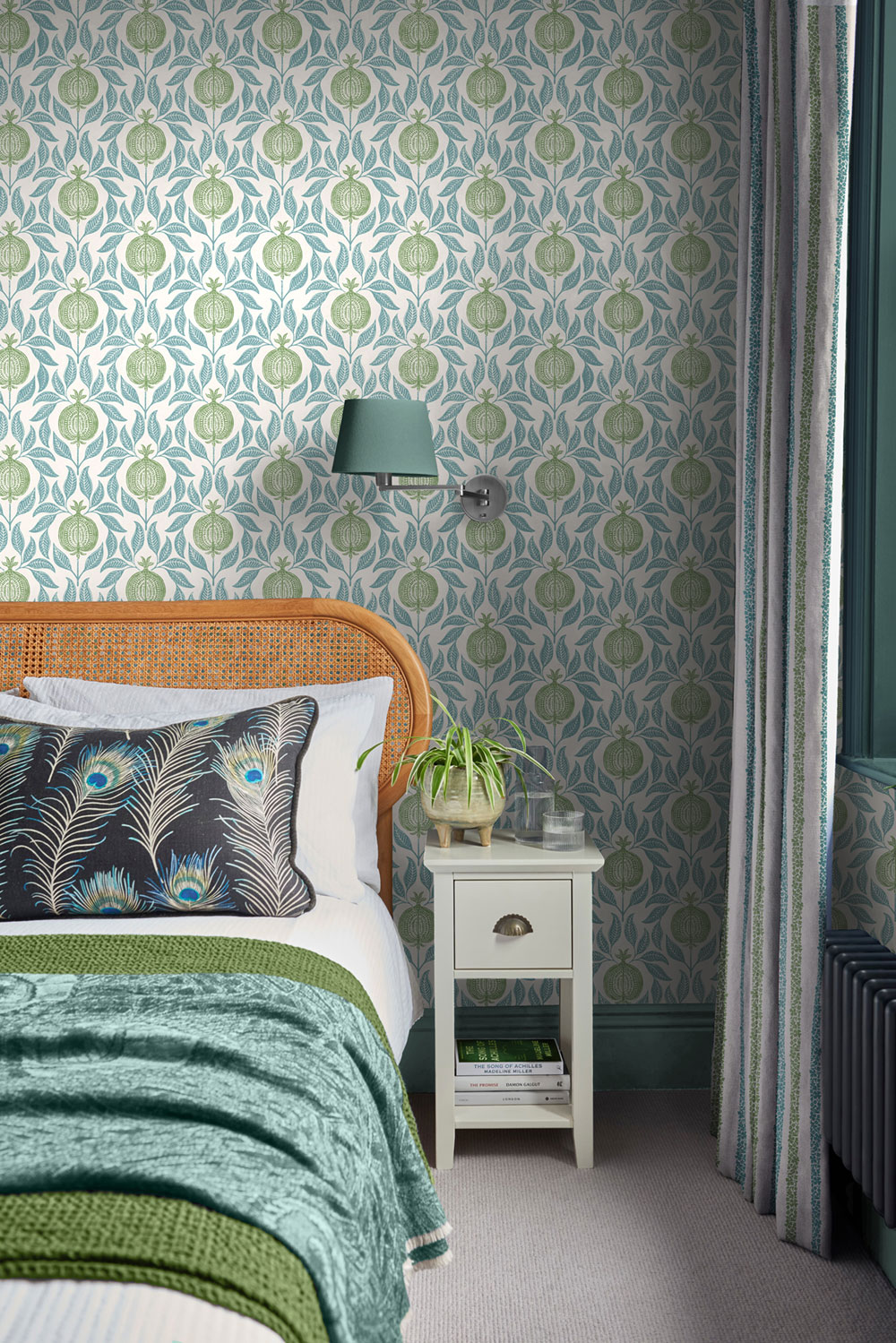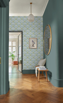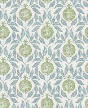 Tapete, hellbeiger Hintergrund, Motive von blauen Blättern und grünen Granatäpfeln.