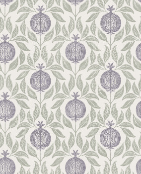 Tapete, hellbeiger Hintergrund, Motive von salbeigrünen Blättern und violetten / mauvefarbenen Granatäpfeln.