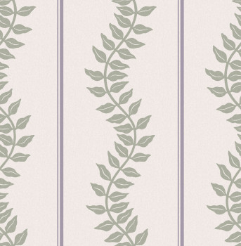 Tapete, hellbeiger Hintergrund, violette Streifen, salbeigrüne Lorbeerblätter.