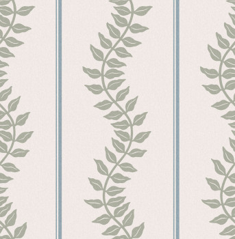 Tapete, hellbeiger Hintergrund, blaue Streifen, salbeigrüne Lorbeerblätter.