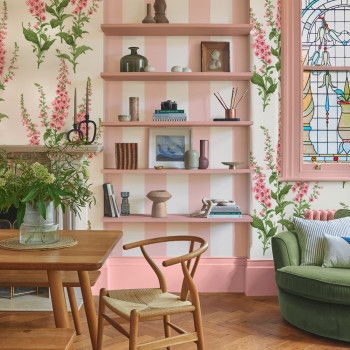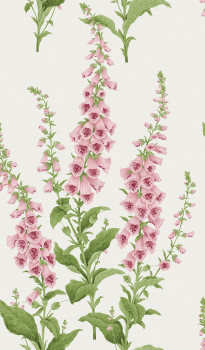 Tapete, cremefarbener Hintergrund, Fingerhut-Muster in Rosa- und Grüntönen.