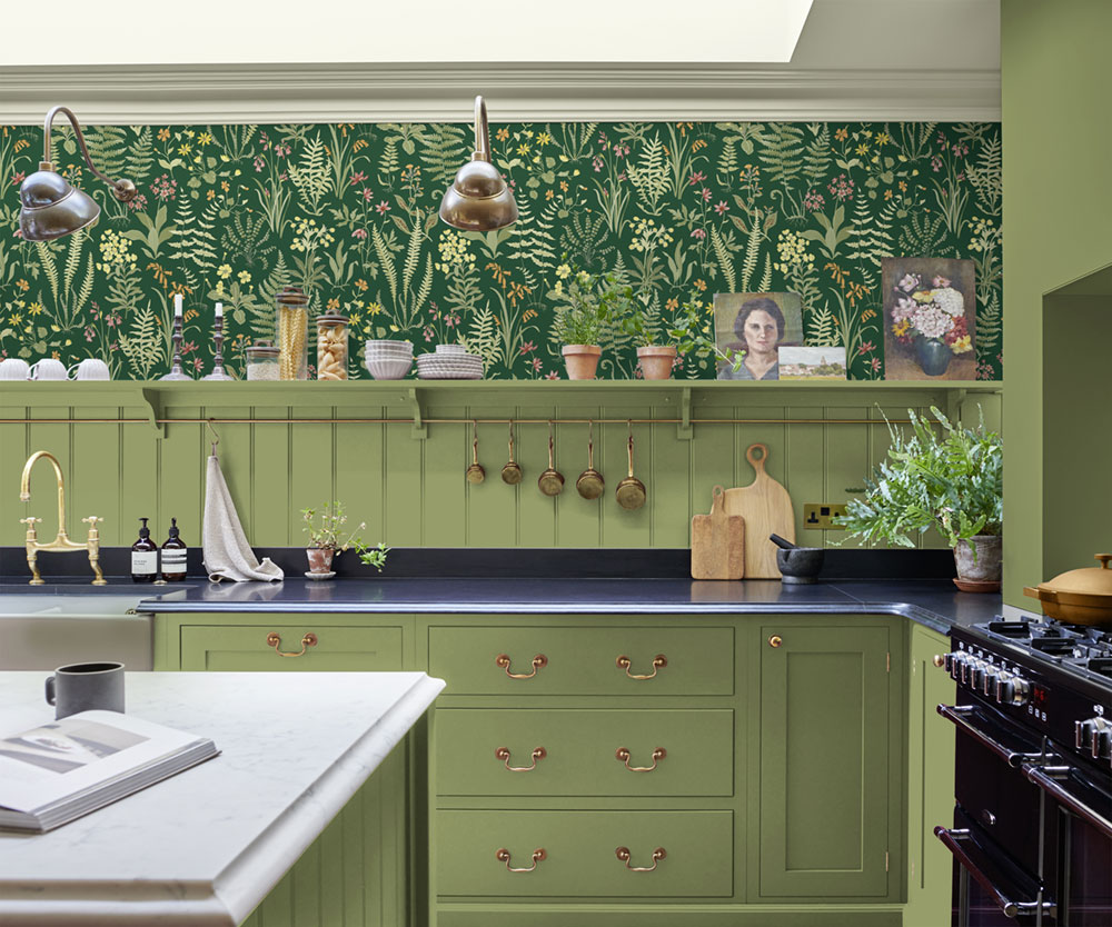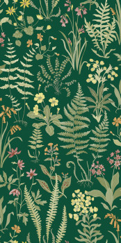Tapete, dunkelgrüner Hintergrund, Muster aus Frühlingsblumen und Farnen.