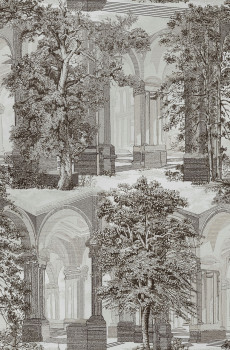 Vliestapete mit Motiv von historischen Arkaden und Bäumen in halbglänzenden Grau-Beige-Tönen.