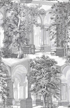 Vliestapete mit Motiv von historischen Arkaden und Bäumen in halbglänzenden Grau-Schwarz-Tönen.