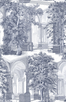 Vliestapete mit Motiv von historischen Arkaden und Bäumen in Blau- und Graublau-Tönen.