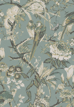 Vliestapete mit exotischen Vögeln zwischen Blumen und Ästen, halbglänzender türkisfarbener Hintergrund, gold-beiges und türkisfarbenes Muster, faserige Textur.