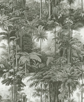 Vliestapete mit Motiv Dschungel, Palmen, Bäumen, Blättern in Grau-Schwarz-Tönen.